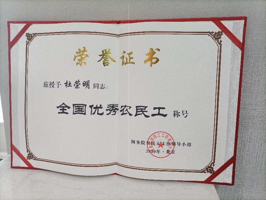 2021年1月6日 红桃视频在线观看,国务院农民工工作领导小组召开“全国优秀农民工和农民工工作先进集体”表彰大会,对994名全国优秀农民工和100个农民工工作先进集体进行了表彰,江苏省共有79人获得“全国优秀农民工”称号,我公司高端工厂杜荣明总监名列其中。